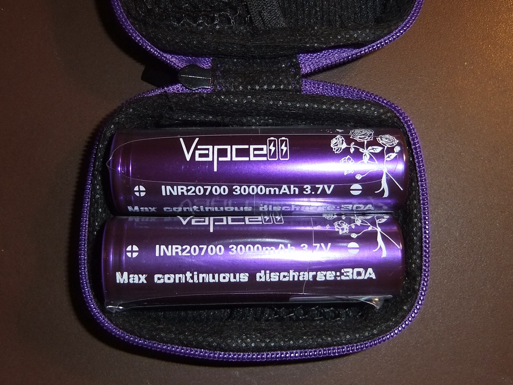 2 x Vapcell 3000mAh 20700 batteries in a zipped protective case.